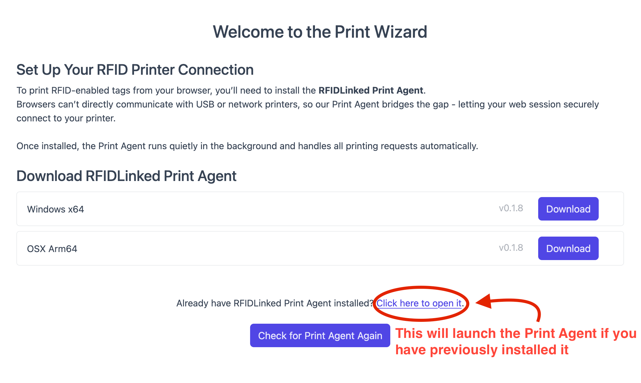 You must have the RFIDLinked Print Agent installed and running on your computer. -