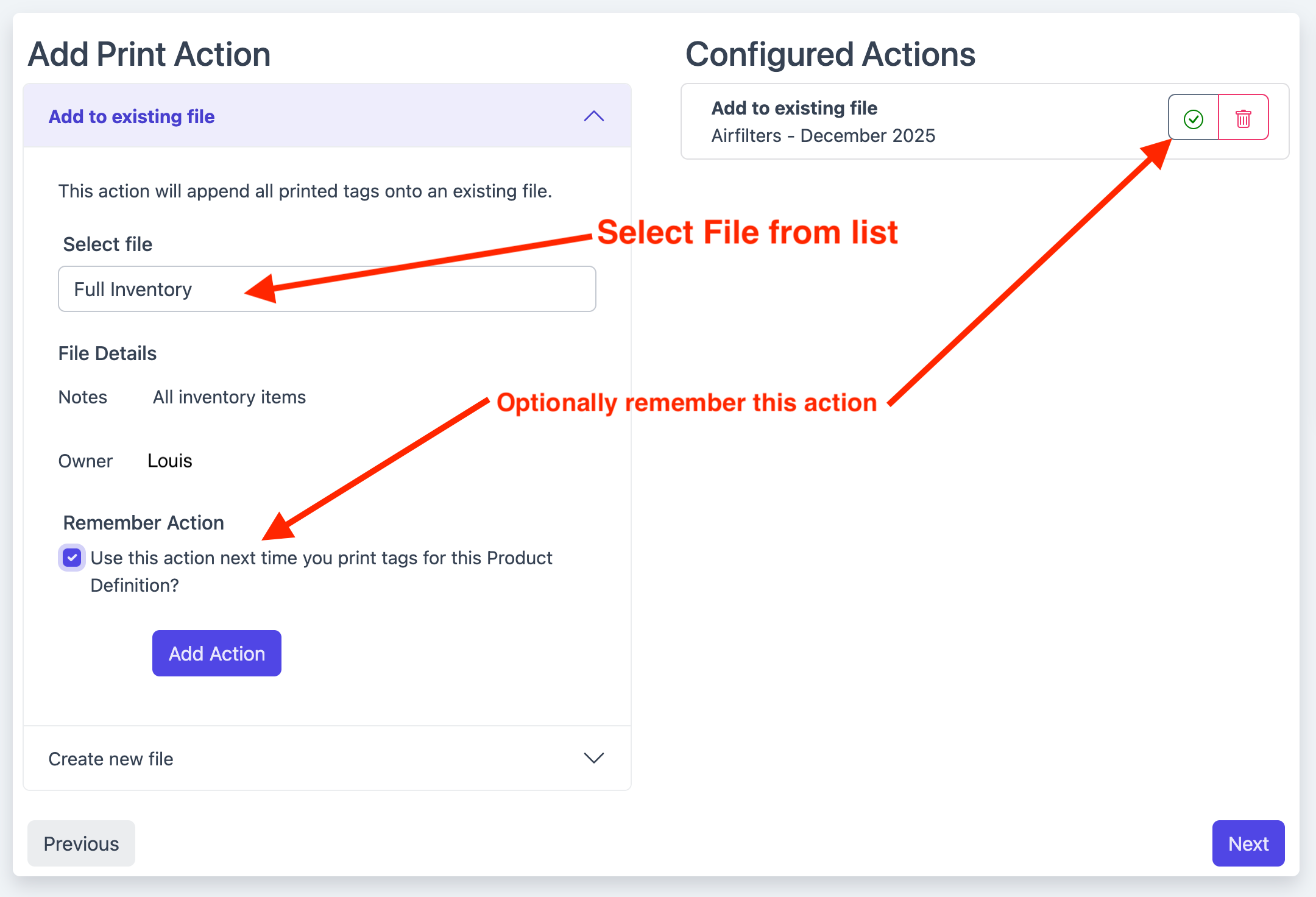 Actions are optional, but allow you to automatically add any printed tags to one or more Files for easier management/organization of your tags. -