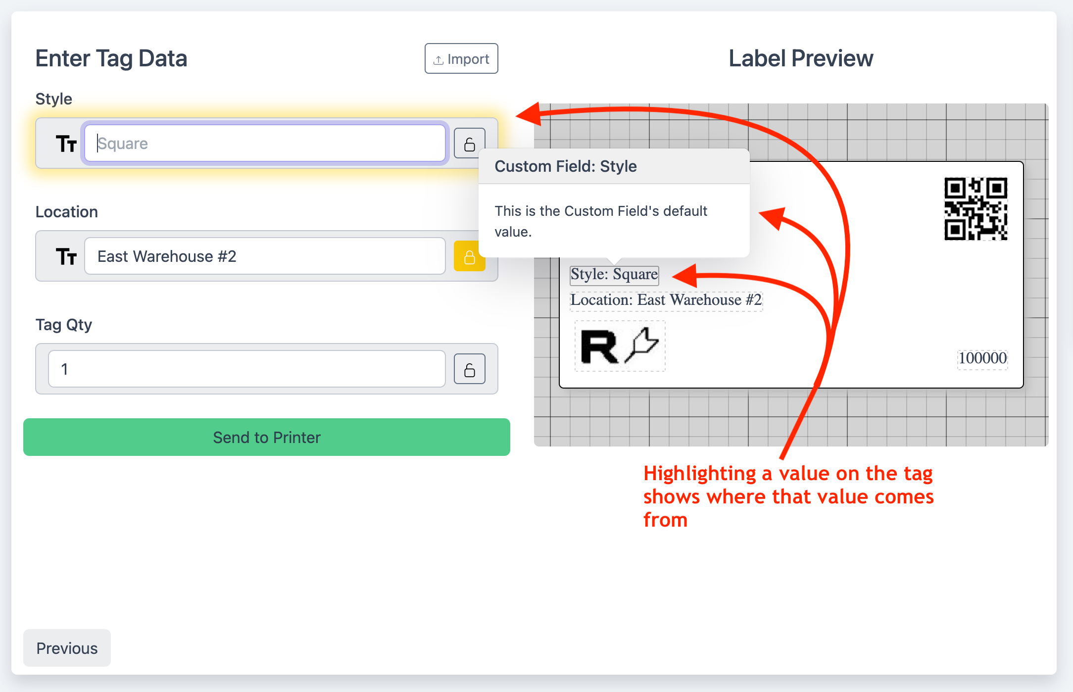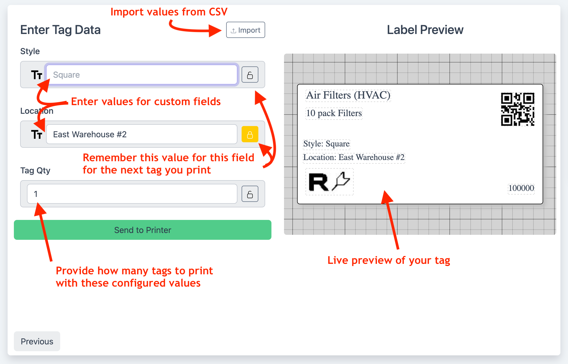 A lock icon next to each input lets you remember the last used value, which is helpful when printing multiple tags with shared values.